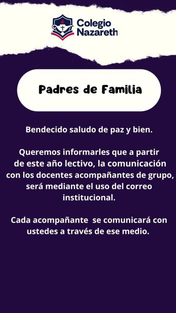 Se le informa a toda la comunidad que a partir de este año escolar, la comunicación con los docentes acompañantes de grupo, será mediante el uso del correo institucional.